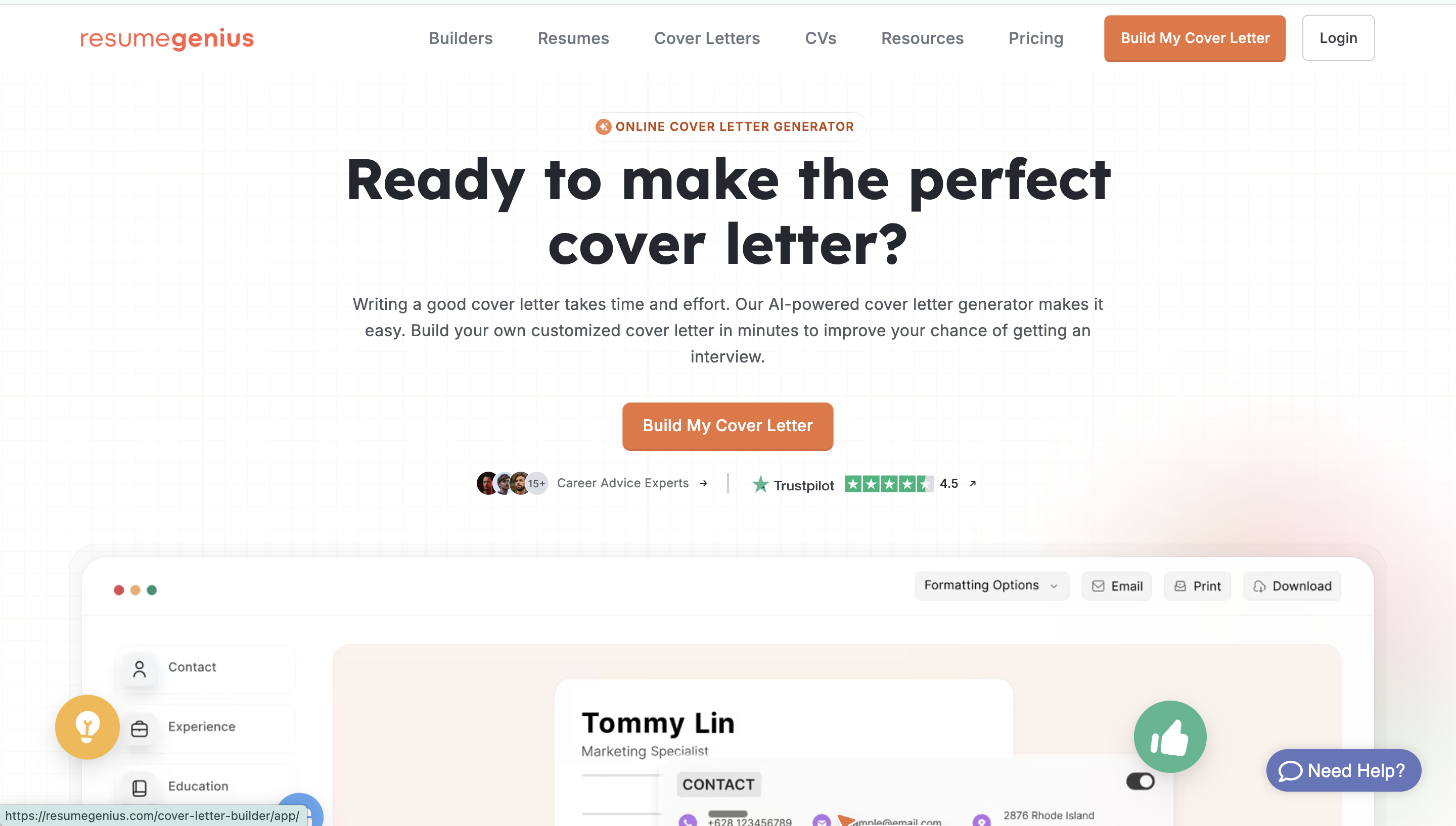 Resume Genius is perfect if you prefer a step-by-step builder that walks you through each section of your letter. It’s great for users who want structure without worrying about formatting.