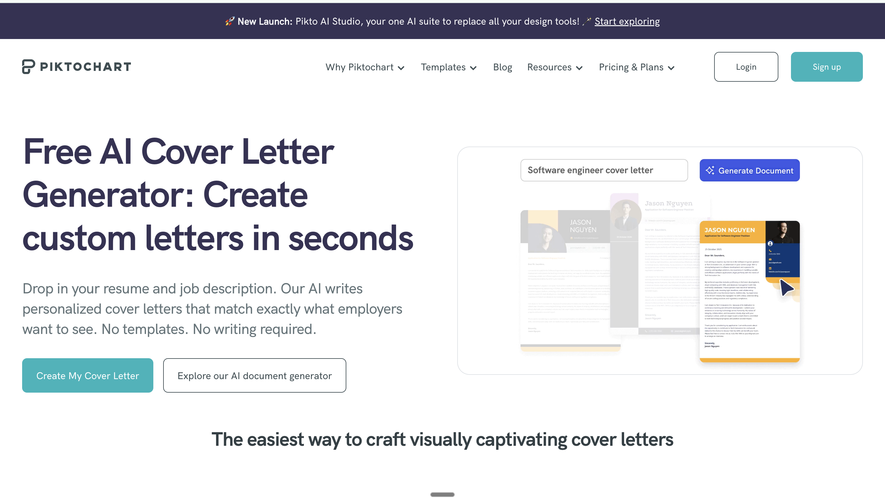 Creative design: Piktochart is perfect if you need visually appealing, infographic-style cover letters.