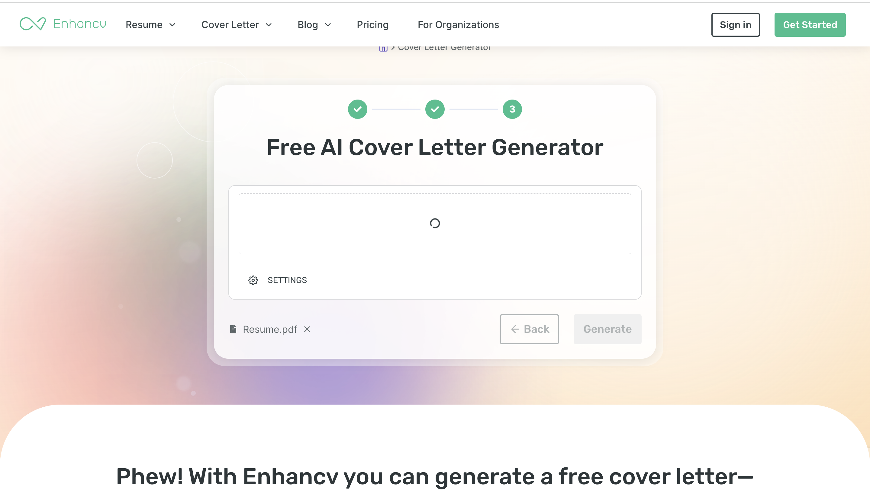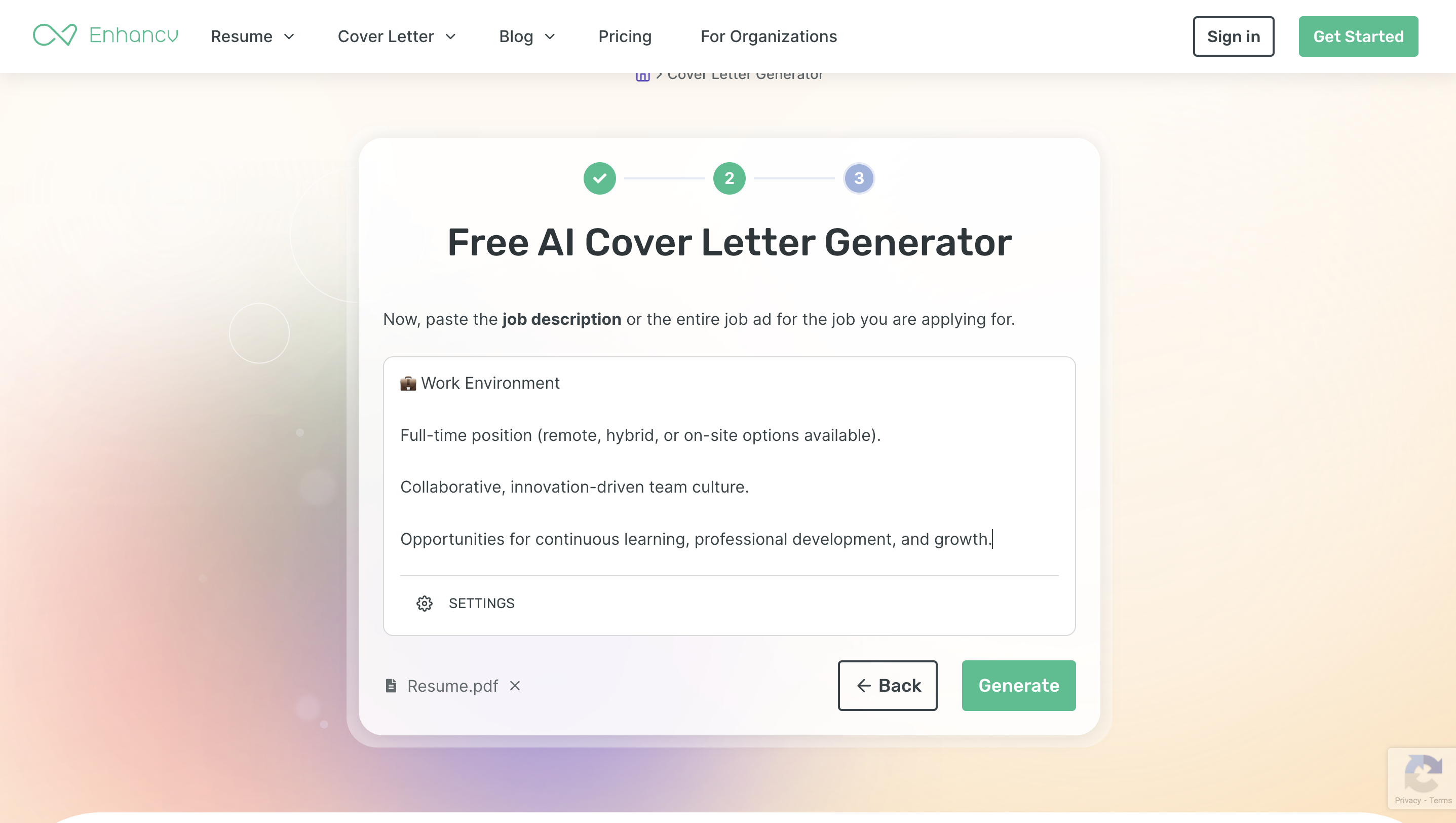 Requires Resume Upload: The generator depends on a resume to personalize content, so it’s not ideal for users who prefer to build a cover letter entirely from scratch.