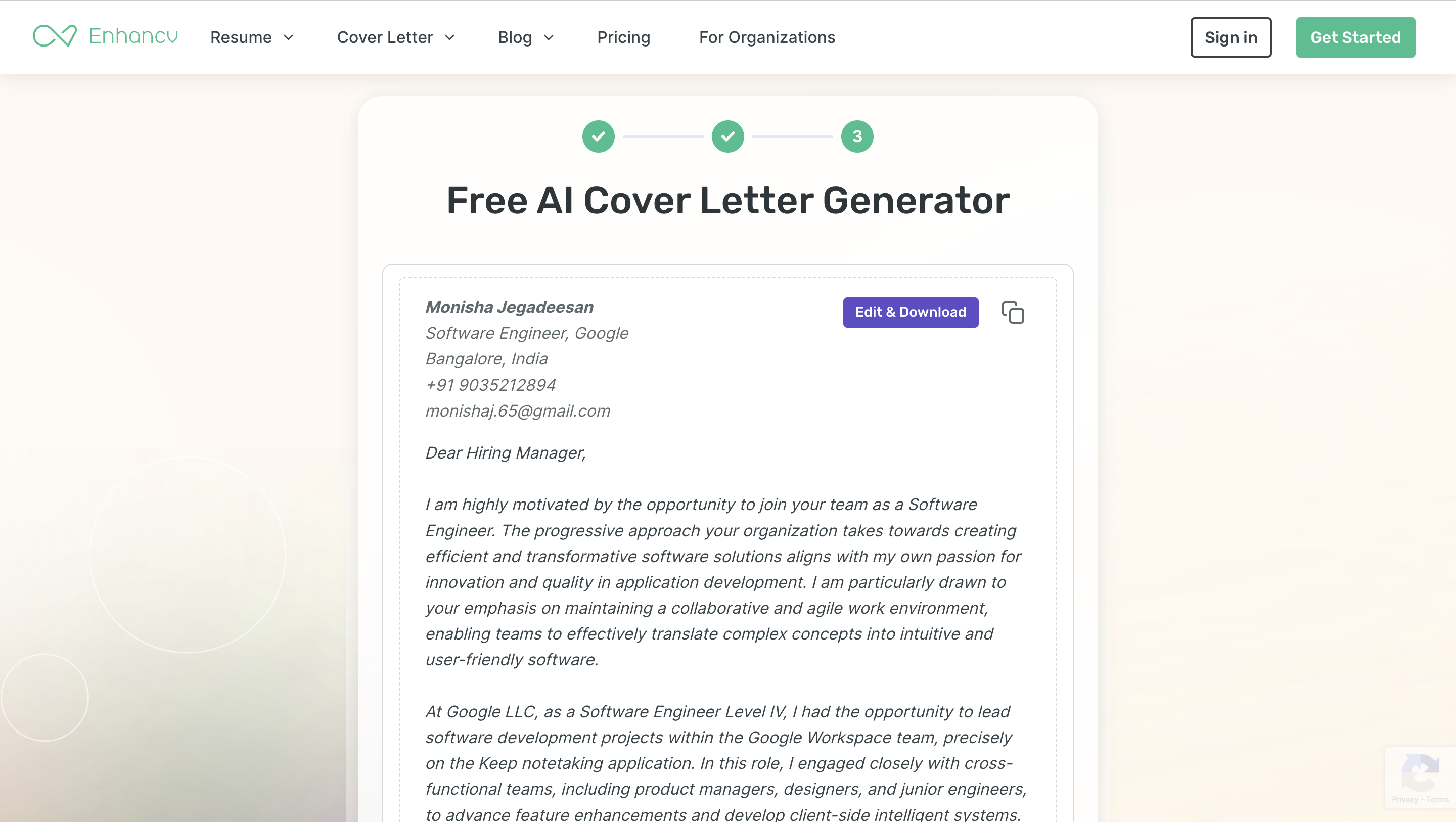 Enhancv is a modern resume and cover letter platform designed to help job seekers create polished, professional applications with ease. Its Cover Letter Generator is one of its most popular tools, offering a simple way to turn your resume and a job description into a complete, well structured cover letter in minutes.