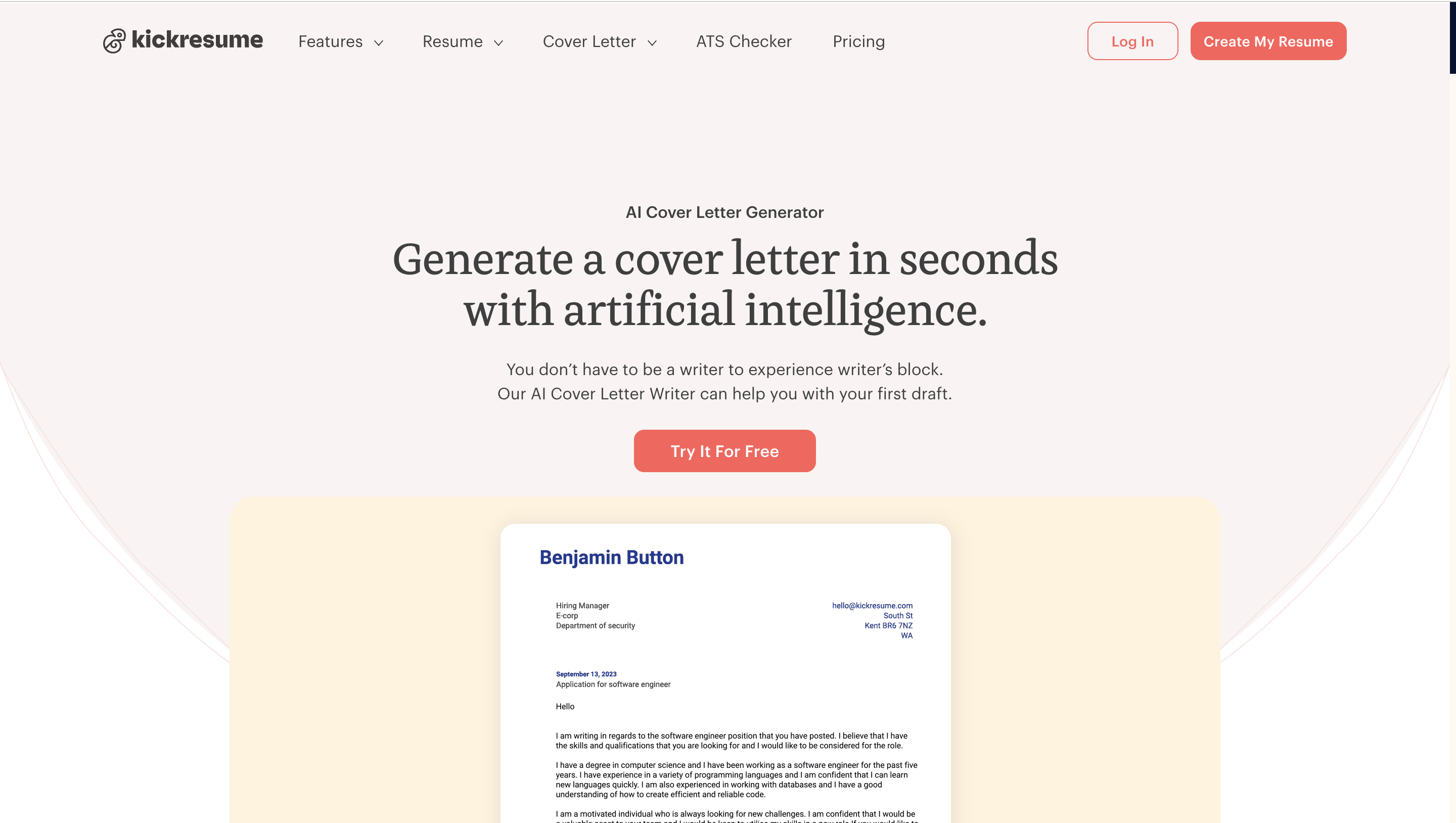 Step 1: Go to the Kickresume Cover Letter Generator and click “Try It For Free.”