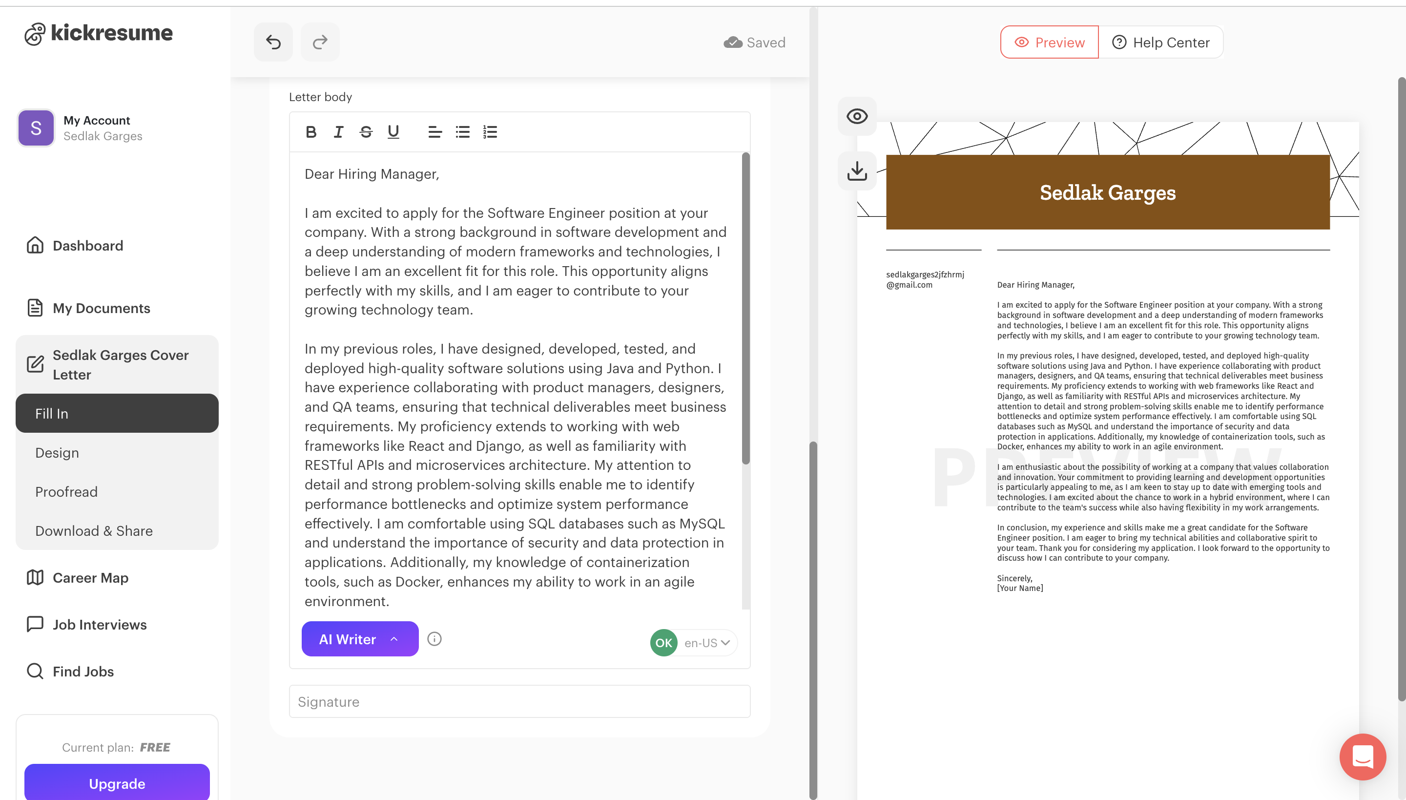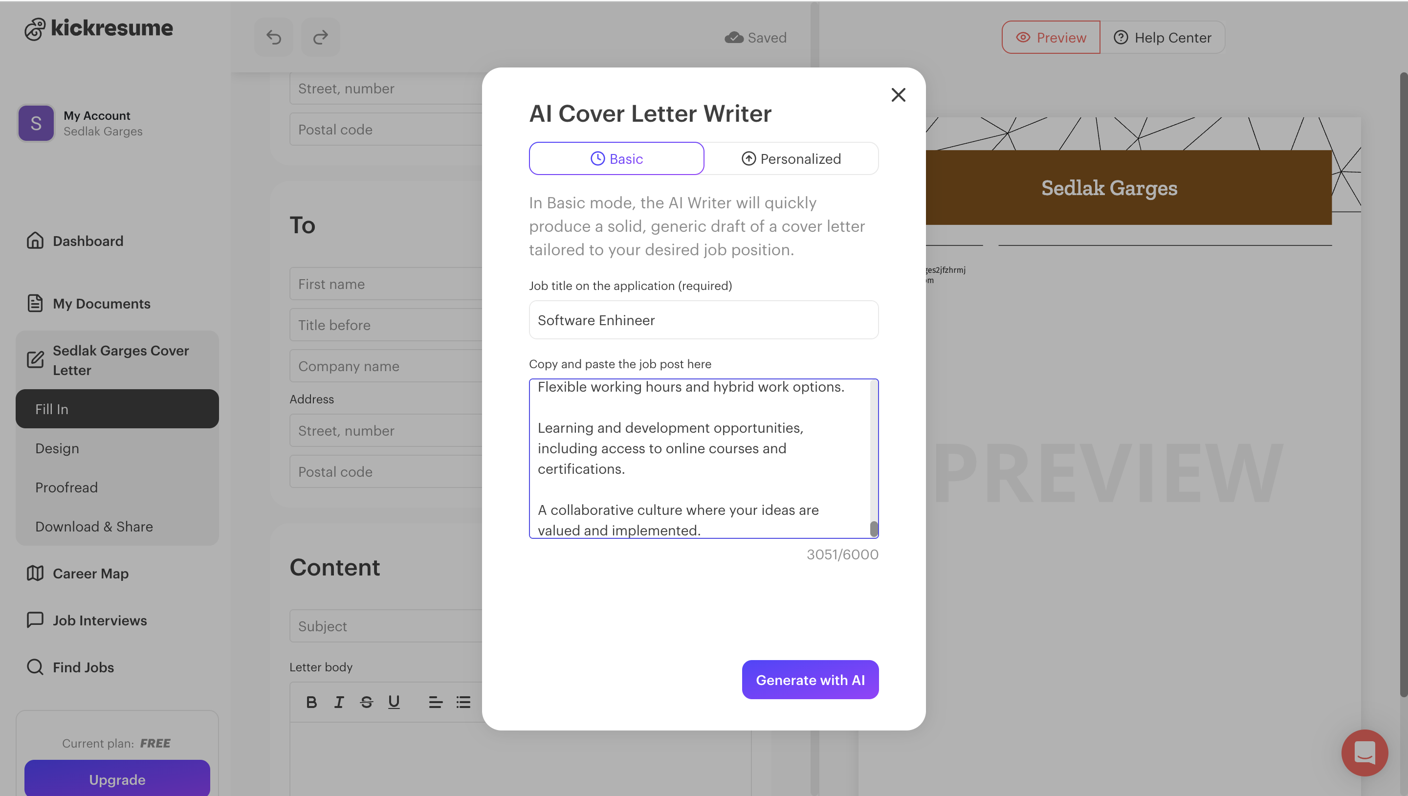 Kickresume is a popular career platform known for its clean design, user-friendly tools, and strong AI integration. Its AI Cover Letter Generator, powered by GPT-4, stands out for its ability to transform your resume and a job description into a fully structured, personalized cover letter in seconds.