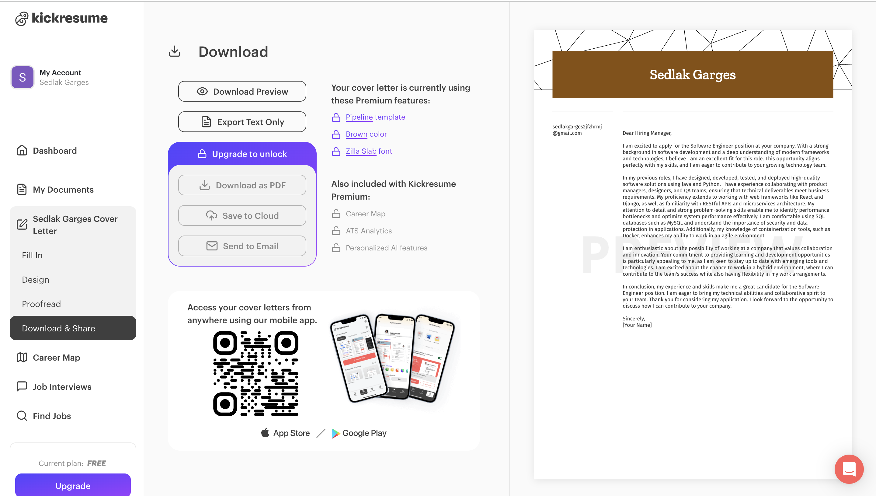 Step 5: Click Download & Share to save your cover letter as a PDF or Word file — or send it to your email, Google Drive, or Dropbox.