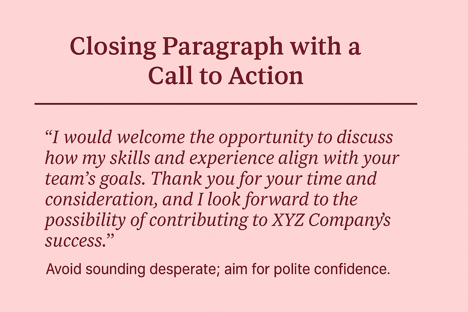 This section should demonstrate alignment between your abilities and the employer’s needs. Mirror key phrases from the job description so your letter resonates with both recruiters and ATS software.
